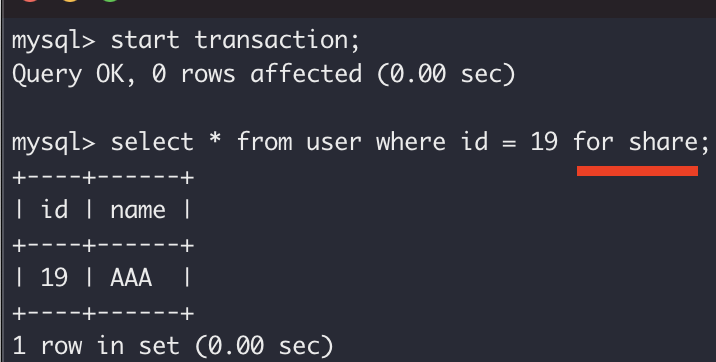 첫번째 세션에서 트랜잭션을 시작하고, select * from user where id = 19 for share; 명령어로 id가 19인 row에 share 잠금을 획득합니다.