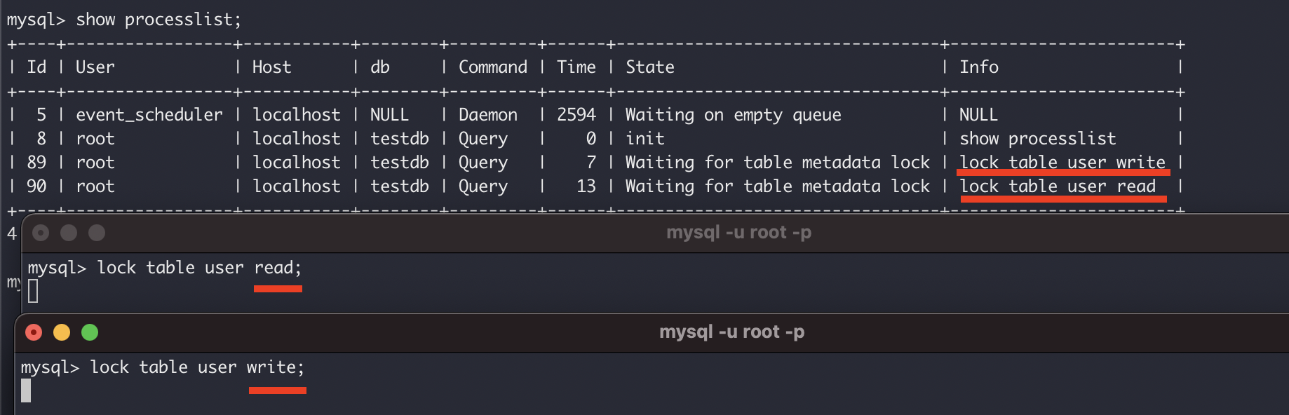 - 다른 세션에서, READ, WRITE 잠금 요청 시 모두 대기 하게 됩니다.READ와 마찬가지로 WRITE lock을 release하는 순간 모든 대기중인 요청이 수행됩니다.
