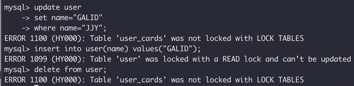 - LOCK을 얻은 세션에서 읽기만 가능 하며 쓰기(insert, update, delete) 작업을 수행할 수 없습니다.