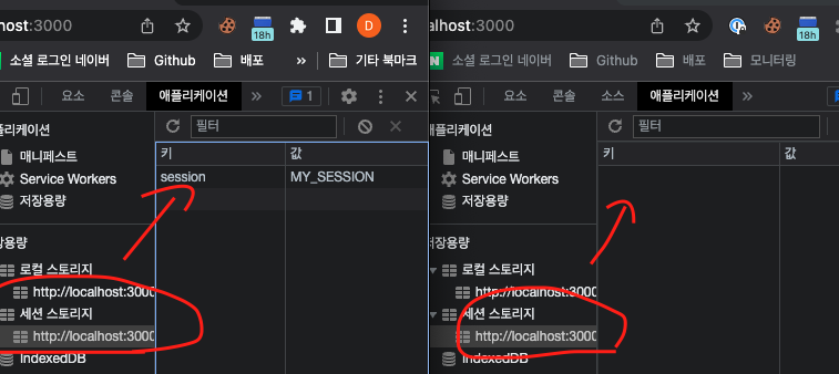세션스토리지 의 경우 브라우저가 닫히면 저장된 값들이 모두 사라지며 탭과 브라우저간의 공유가 되지 않습니다.