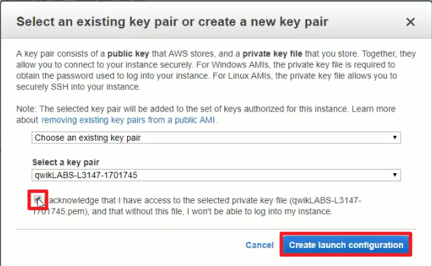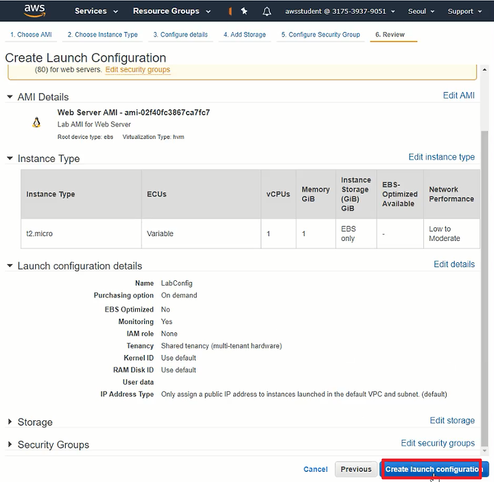 설정 정보를 확인한다음 Create launch configuration을 클릭한다