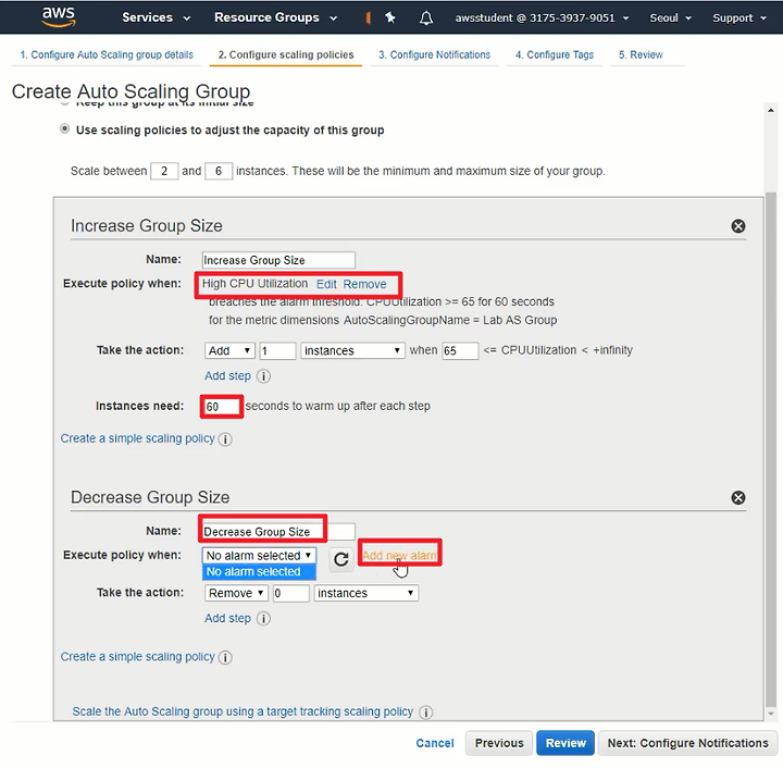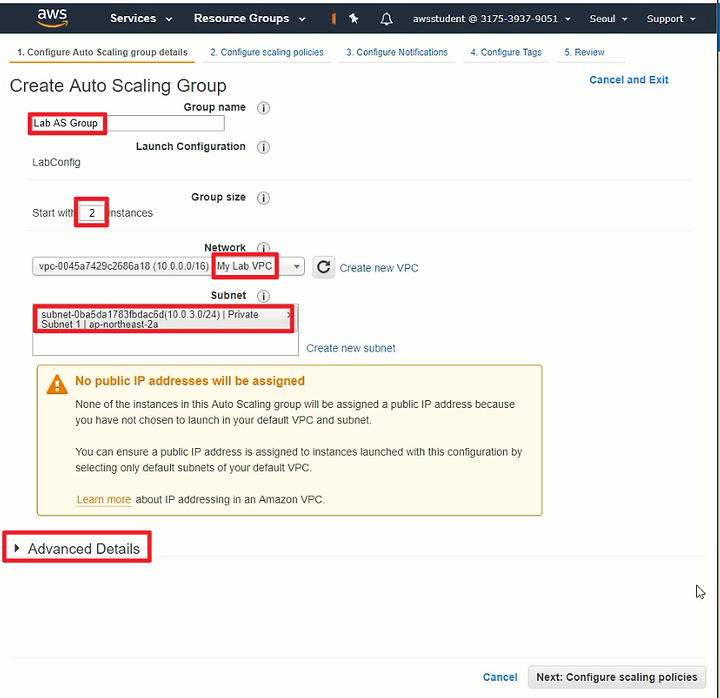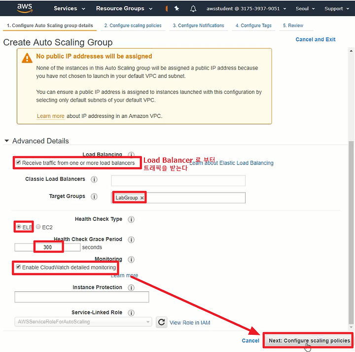 3. AutoScaling Group을 생성하며 위에서 생성한 LaunchConfiguration을 지정한다
