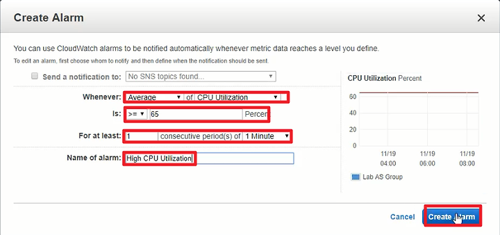 4) Name of alarm : High CPU Utilization