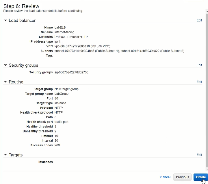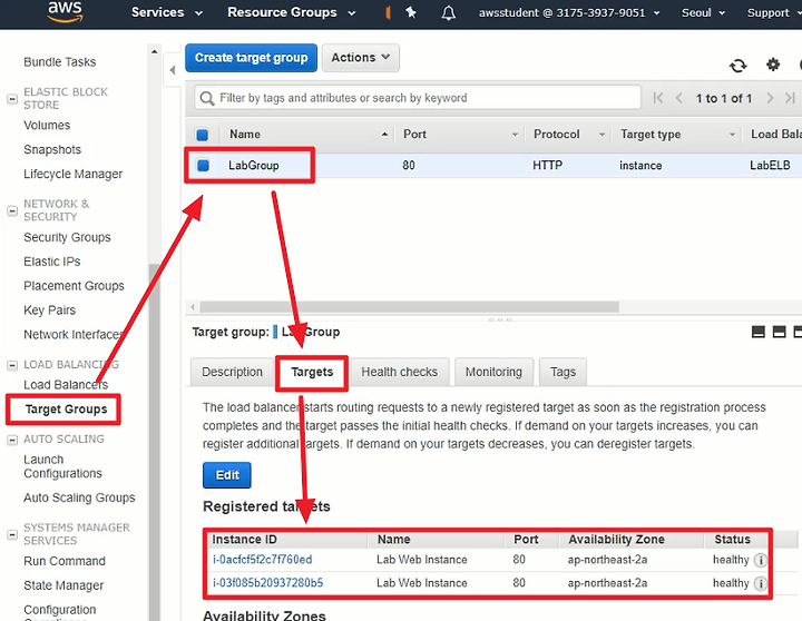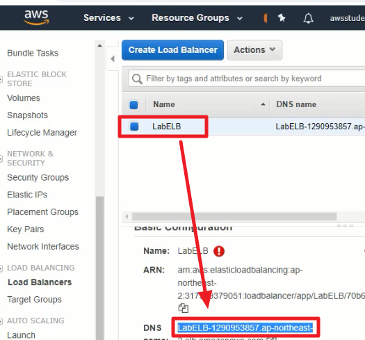 추가 적으로 Load Balancers 탭의 LabELB를 클릭하고 DNS명을 기억해놓는다