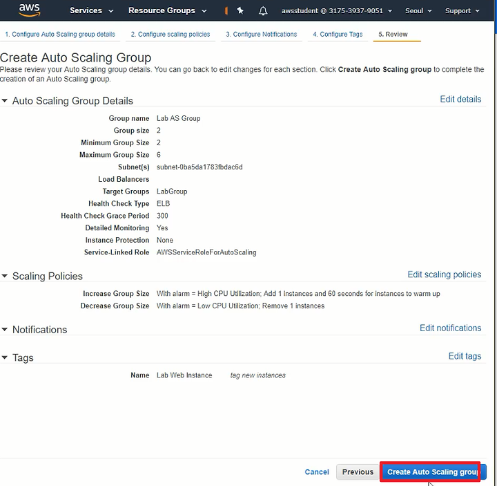 설정 정보를 확인하고 Create Auto Scaling Group를 클릭한다