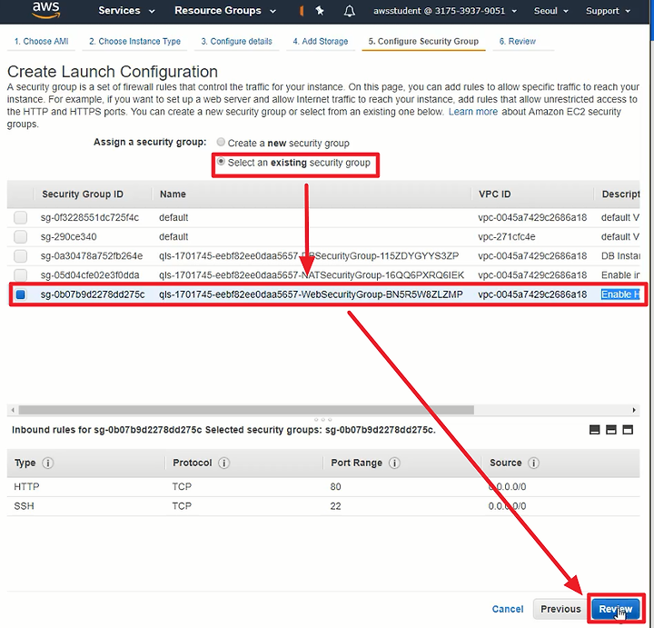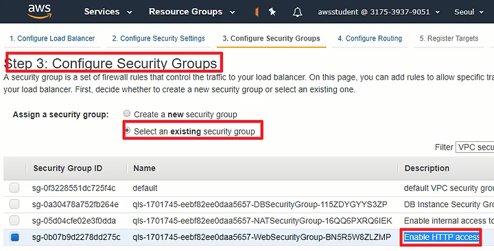 1) Select an existing Security Group을 선택하여 이미 존재하는 보안그룹을 선택한다