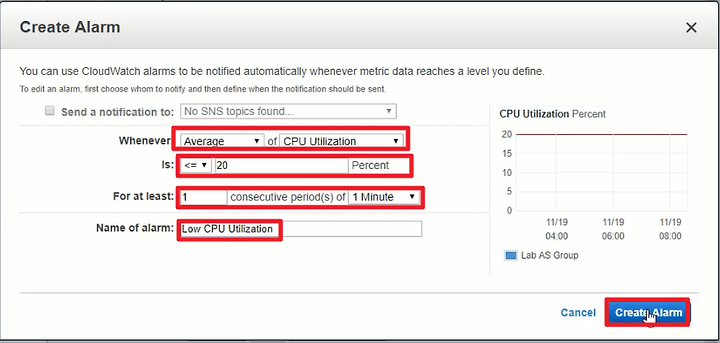 4) Name of alarm : Low CPU Utilization