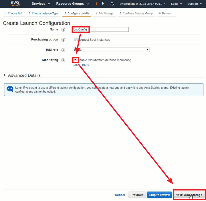 2) Monitoring 의 Enable CloudWatch detailed monitoring 를 체크한다