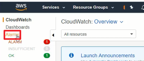 좌측탭의 Alarms를 클릭한다