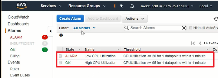 AutoScaling Group을 만들때 만든 Alarm 2개가 보인다