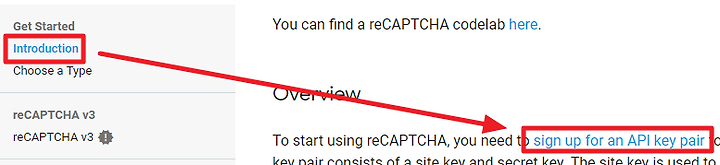 2. Introduction 탭에서 sign up for an API key pair를 클릭하여 reCAPTCHA에 사용될 키쌍을 생성한다