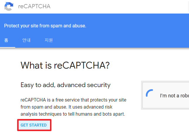 1. google reCaptcha를 검색하여 들어온다음 GET STARTED 버튼을 누른다