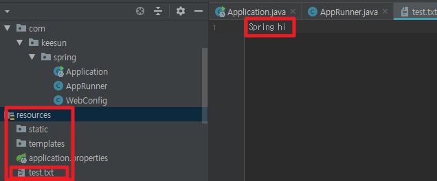 우선 resources디렉토리 하위에 test.txt를 만듭니다.